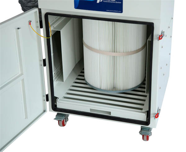 Дымоуловитель основан на многоразовом высокоэффективном цилиндрическом HEPA фильтре H13. Картридж автоматически очищается встроенной пневматической системой. Он подходит для фильтрации большого количества мелкой пыли от работы промышленных станков и ручной обработки.