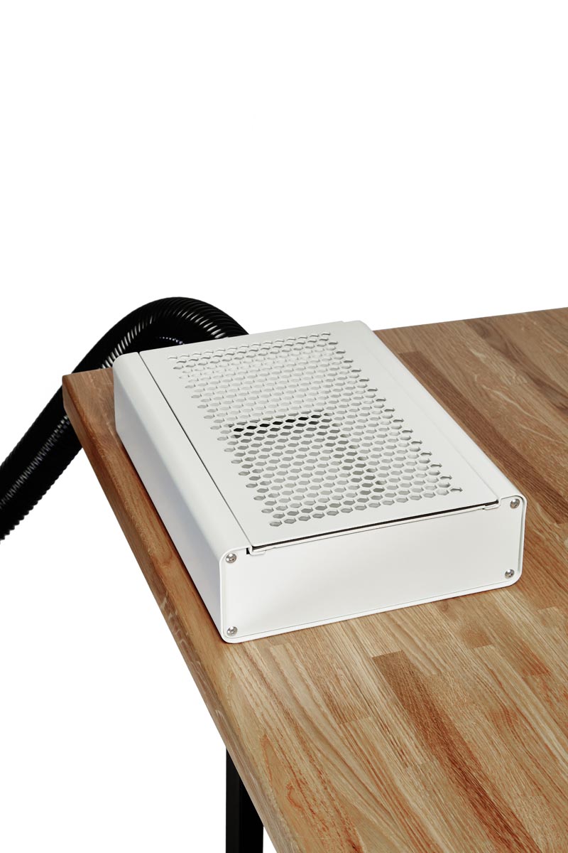 Комплектный настольный лоток для сбора пыли можно установить в столешницу. Лоток изготовлен из прочной стали с износостойким покрытием, которое не боится химических средств и маникюрных инструментов. Крышка-решетка лотка на магнитах легко снимается, чтобы его можно было тщательно почистить.