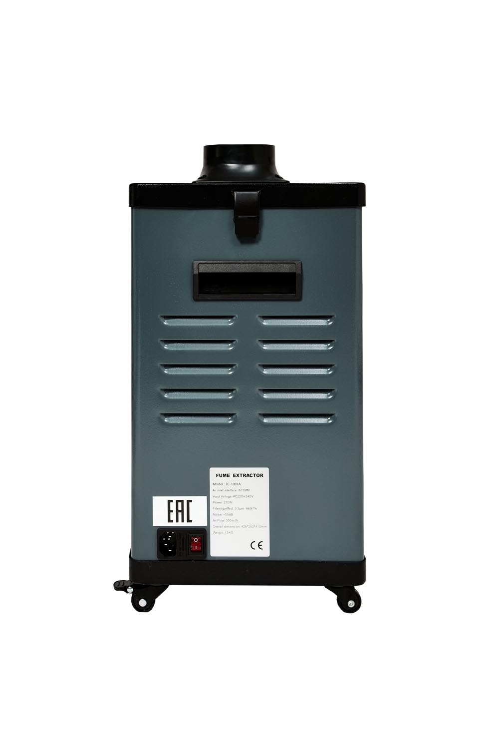 Дымоуловитель оснастили колесиками для легкого перемещения и встроенным шумогасителем. Так что пользоваться им будет комфортно и просто. Просто включите его в розетку, подсоедините дымоприемники и включите.