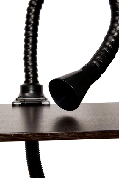 К блоку подключаются гибкие воздуховоды 50мм, которые легко проложить за столом. А дымоприёмники 50мм легко гнутся так, чтобы подвести их к источнику дыма вплотную. Дымоприёмники запоминают свою форму, и их возможно удлинить или укоротить.