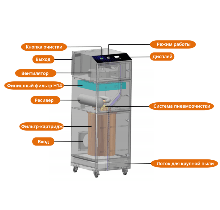 Вытяжки оснащаются HEPA-фильтрами (не подлежат очистке) или самоочищающимися мембранные картриджами H13 со встроенной пневматической системой — для задач с большим количеством пыли.